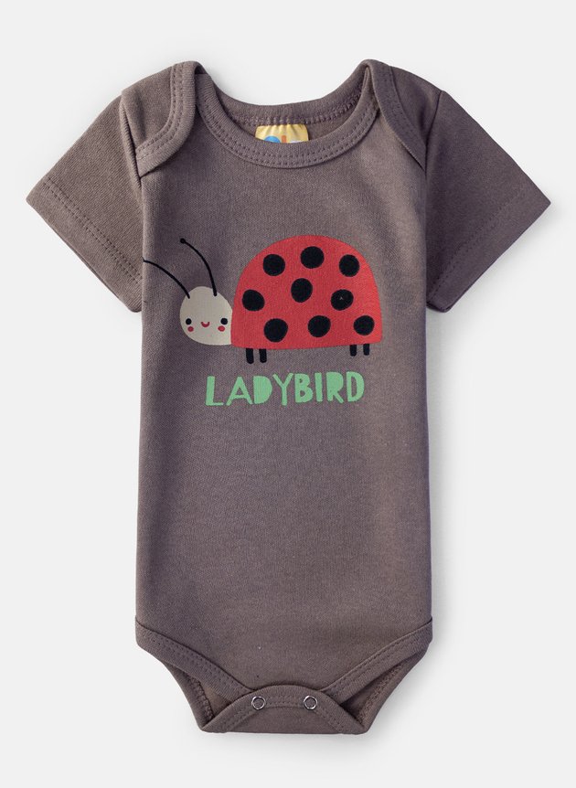 O modelo conta com mangas curtas, transpasse nos ombros e botões de pressão nas entrepernas, facilitando o vestir e proporcionando mais praticidade no dia a dia. A estampa frontal traz uma joaninha fofa acompanhada da palavra "Ladybird", criando um visual lúdico e encantador.