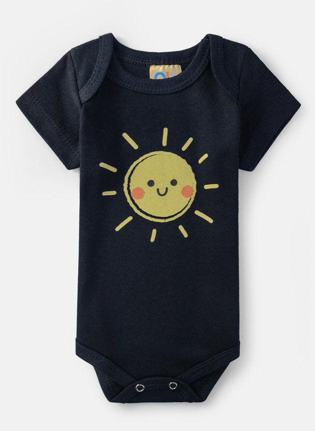 Confeccionado em algodão macio na cor preto, este body conta com mangas curtas, transpasse de ombros que facilita na hora de vestir e botões de pressão nas entrepernas, garantindo praticidade nas trocas. A estampa frontal com um solzinho sorridente traz um toque divertido e cheio de energia para o look dos pequenos.