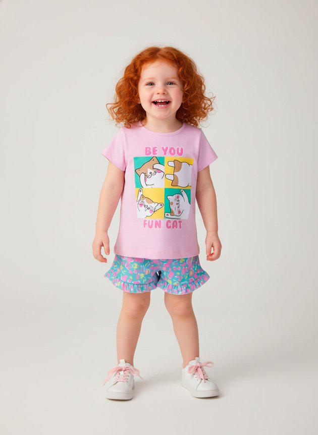 A blusa é confeccionada em 100% algodão na cor rosa bebê, possui mangas curtas e estampa frontal com gatinhos acompanhados da frase Be You Fun Cat, transmitindo alegria e delicadeza ao visual.
