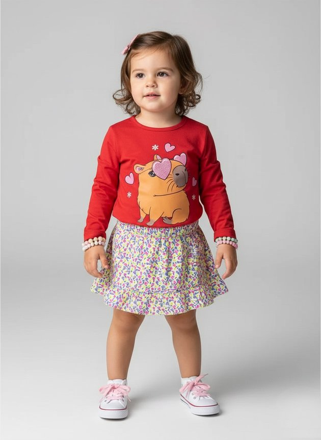 A blusa é confeccionada em algodão na cor vermelho, com mangas longas e uma estampa frontal encantadora de uma capivara usando óculos em formato de coração, repleto de glitter, além de outros corações brilhantes que deixam o look ainda mais delicado e alegre.