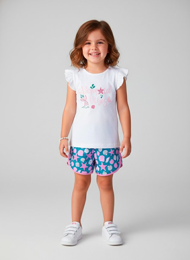 O shorts, confeccionado em tactel, complementa o conjunto com leveza e praticidade. Possui cós elástico rebatido para maior conforto, barra contraste na cor rosa, e um cadarço branco com detalhes em prata que trazem sofisticação. A estampa corrida com conchas e estrelas do mar sobre um fundo turquesa, simulando o movimento do mar, completa o look de maneira encantadora.