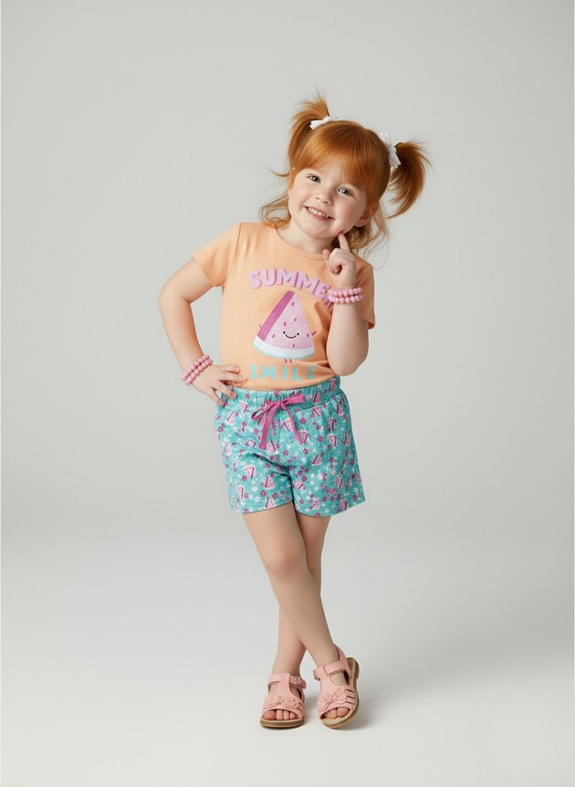 O shorts é confeccionado em moletinho leve e macio, trazendo praticidade e liberdade de movimentos. Conta com cós em elástico rebatido para ajuste confortável e seguro, além de cadarço aplicado na cor rosa que harmoniza perfeitamente com o tema. A peça é finalizada com uma estampa corrida exclusiva, trazendo pedaços de melancia e flores sobre um fundo verde água, deixando o conjunto ainda mais vibrante e delicado.