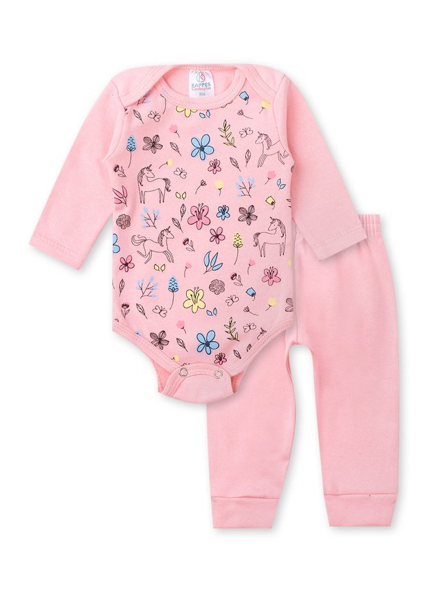 Conjunto composto por duas peças body manga longa confeccionado em ribana 85% algodão no minimo, com estampa frontal. Abertura de botões de pressão entre as pernas e gola tranpassada que facilitam na hora de vestir. Calça confeccionada em ribana 85% algodão no mínimo com cós de elástico.
