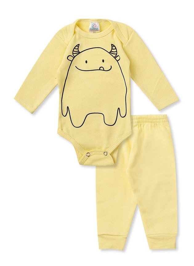 Conjunto composto por duas peças body manga longa confeccionado em ribana 85% algodão no minimo, com estampa frontal. Abertura de botões de pressão entre as pernas e gola tranpassada que facilitam na hora de vestir. Calça confeccionada em ribana 85% algodão no mínimo com cós de elástico.