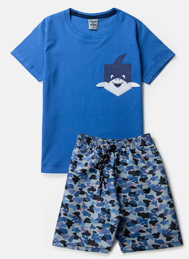 O shorts, feito em tactel, é ideal para brincadeiras sob o sol. Com elástico rebatido e cadarço decorativo, garantem um ajuste confortável. A estampa sublimada de camuflado em tons de azul, com silhuetas de tubarões, traz um toque de aventura marinha ao conjunto.
