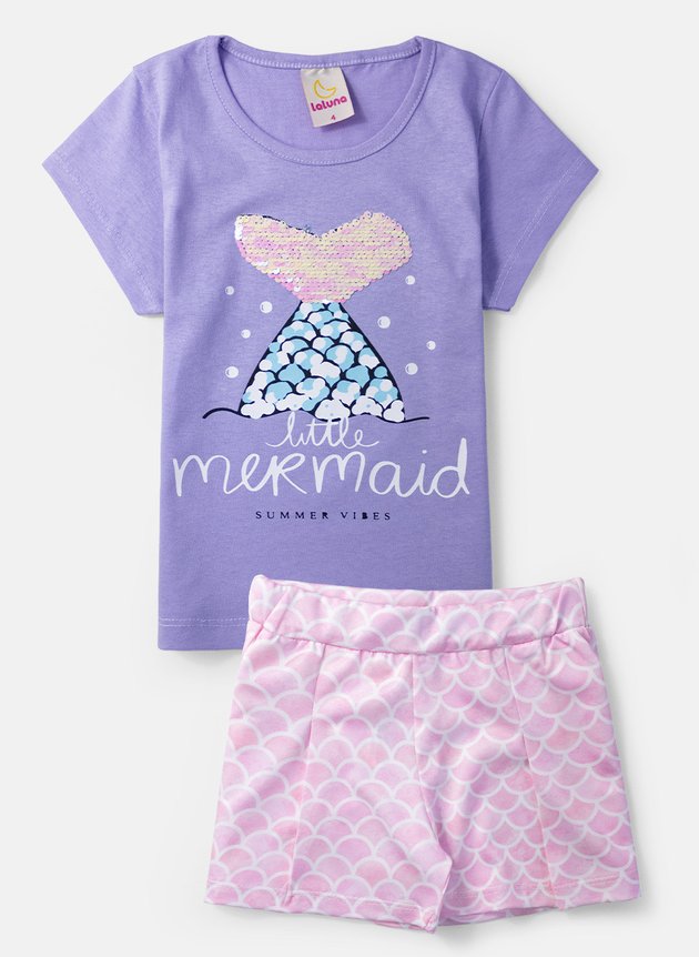 Deixe a magia do mar envolver as pequenas com o Conjunto Infantil Feminino "Sereia Encantadora". A blusa de manga curta, confeccionada em algodão lilás, é adornada com uma estampa deslumbrante da cauda de uma sereia. O toque especial fica por conta do bordado de lantejoulas reversíveis, que brilham em branco furta-cor e prata, adicionando um encanto mágico ao visual.