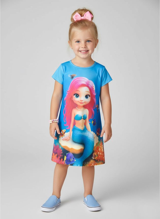 O Vestido Infantil Manga Curta "Sereia e Peixes" é perfeito para um visual lúdico e cheio de magia.